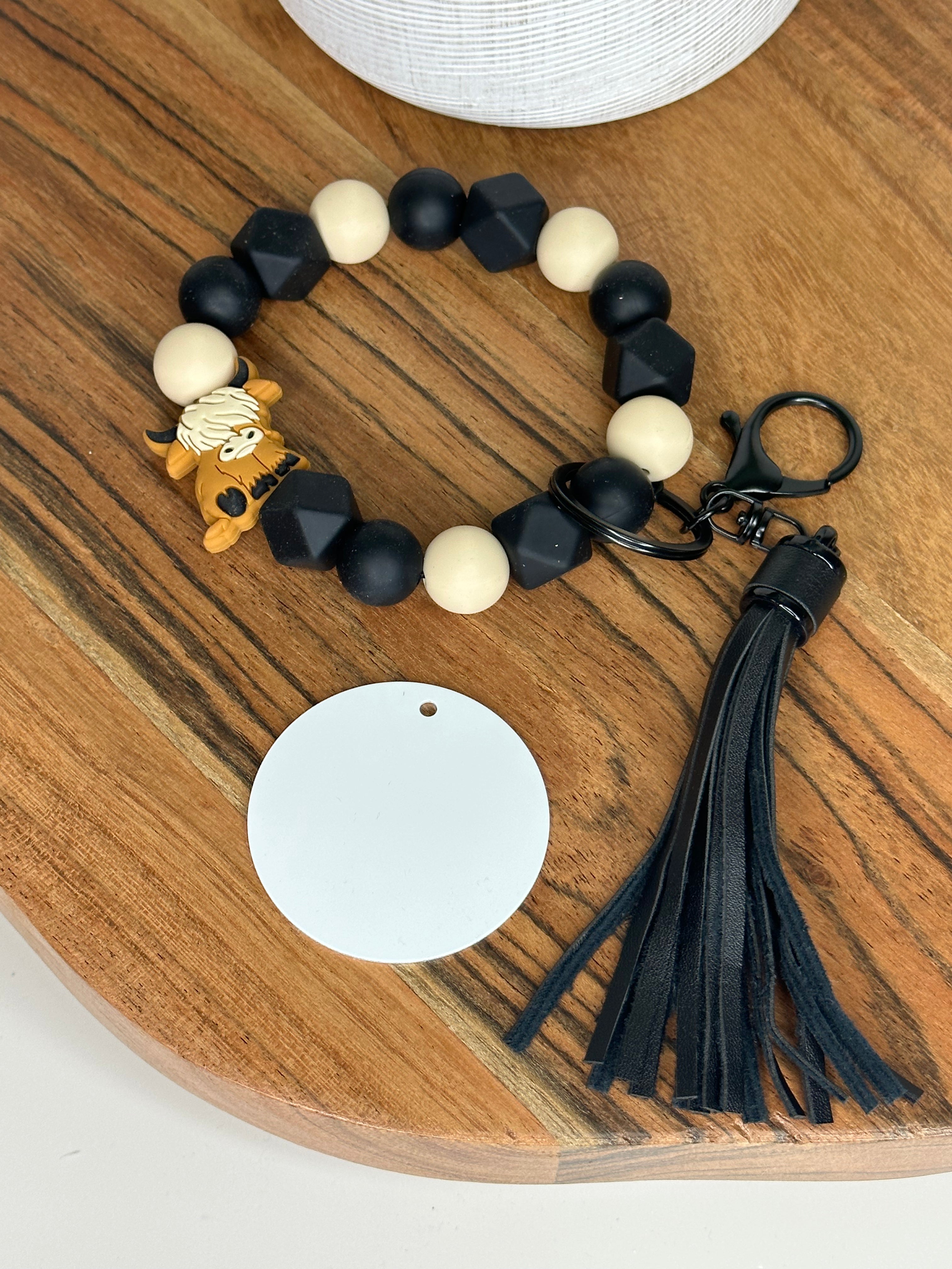 Wood Bead Bracelet Keychain has double layer stretch Cord and Suede Tassel. Has Adorable highland cow focal  silicone Piece & Double sided Aluminum Sublimation Disc!